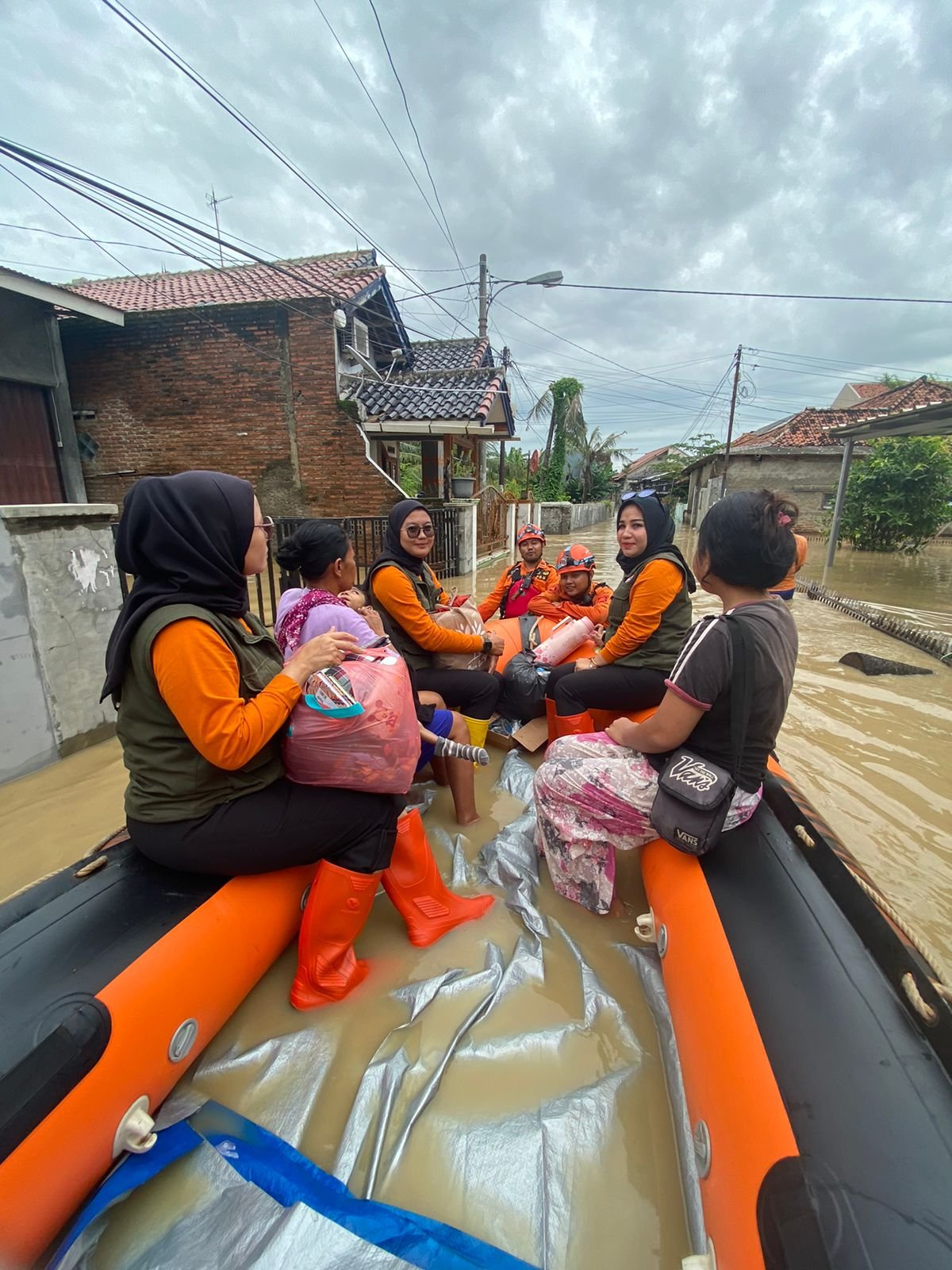 Proses evakuasi pun terus dilakukan tim gabungan dari BPBD, TNI, Polri, Damkar, serta relawan menggunakan perahu karet karena akses jalan terputus oleh genangan air.